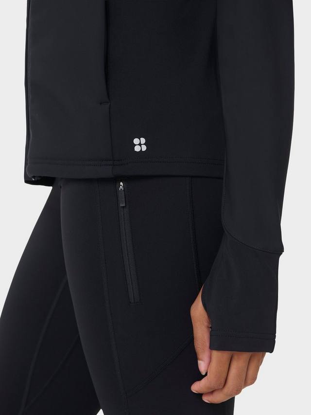 Водонепроницаемая куртка для тренировок на открытом воздухе. Водонепроницаемая ткань Softshell с теплой флисовой подкладкой и влагоотводящими вставками под мышками. Приталенный крой с высоким воротом и отверстиями для больших пальцев для дополнительной защиты. Два передних кармана на молнии.