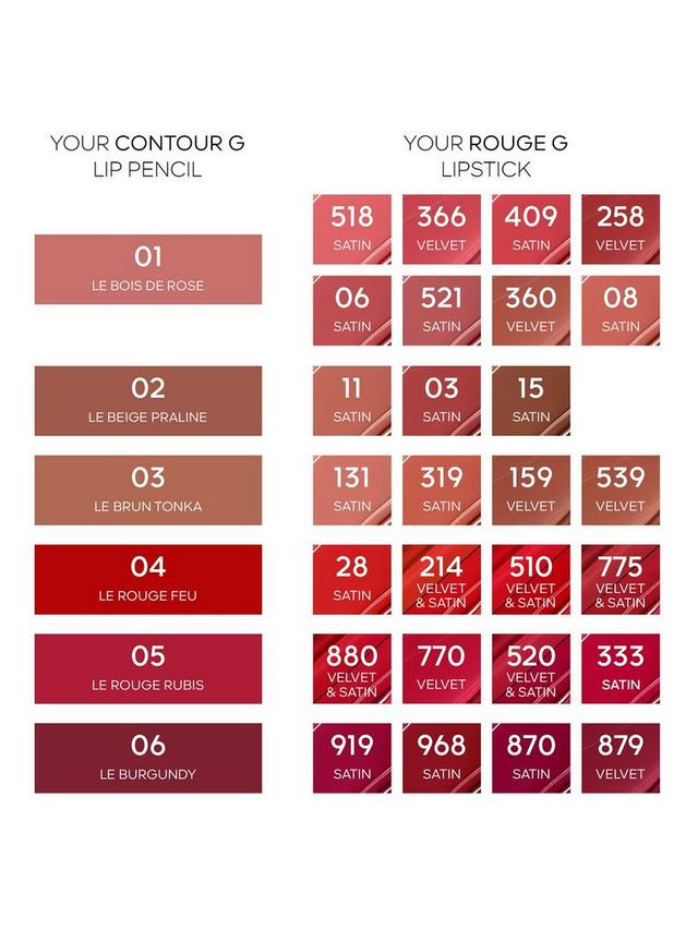Благодаря своей высокопигментированной, стойкой формуле, которая не оставляет следов на губах, карандаш Contour G преображает и подчеркивает губы одним движением. Благодаря ультратонкому кончику и точилке, он преображает губы с невероятной точностью, прекрасно дополняя макияж. Его невесомая текстура обеспечивает мгновенный комфорт и сливается с помадой, оптимизируя ее стойкость.