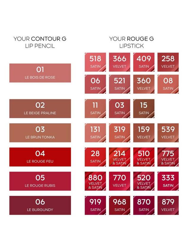 Благодаря своей высокопигментированной, стойкой формуле, которая не оставляет следов на губах, карандаш Contour G преображает и подчеркивает губы одним движением. Благодаря ультратонкому кончику и точилке, он преображает губы с невероятной точностью, прекрасно дополняя макияж. Его невесомая текстура обеспечивает мгновенный комфорт и сливается с помадой, оптимизируя ее стойкость.