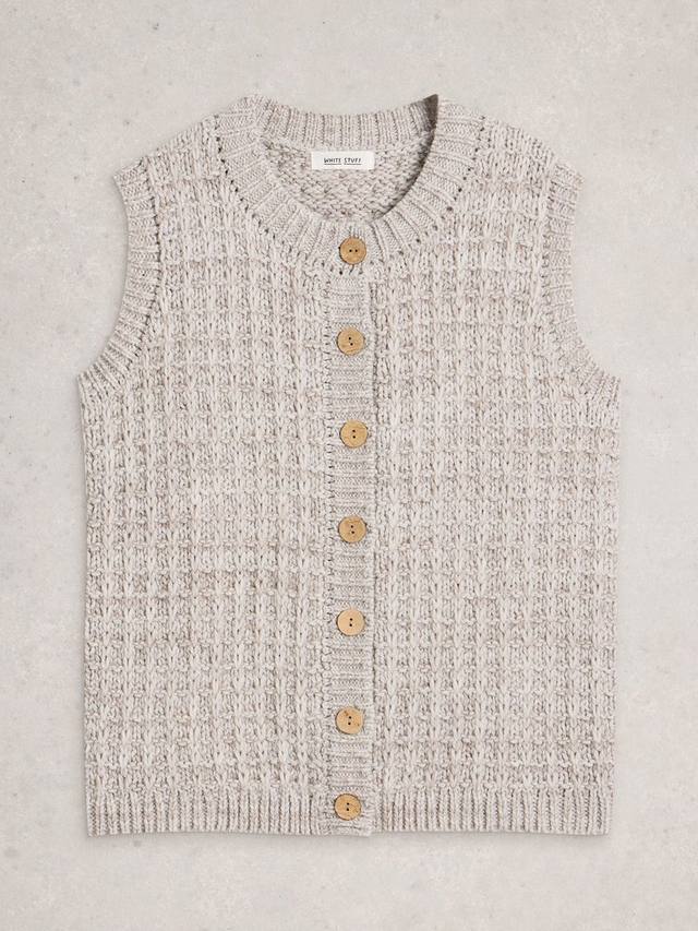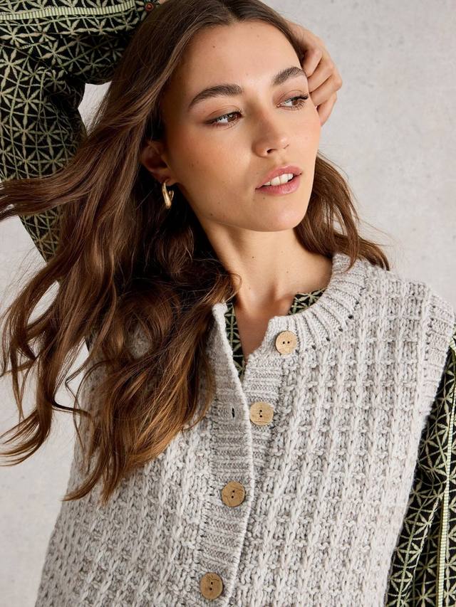 Этот фактурный кардиган без рукавов сочетает в себе тепло и универсальность, идеально подходит для многослойного ношения в любое время года. Круглый вырез горловины и застежка на пуговицы обеспечивают простоту использования.