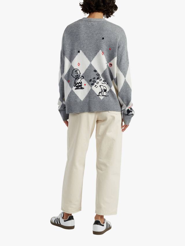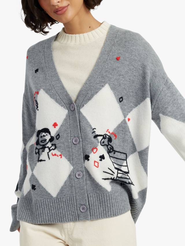 Этот игривый кардиган – эффектная вещь, переосмысливающая классический ромбовидный узор с нотками Аргайл. Связанный из смеси шерсти и кашемира, он украшен ярким ромбовидным узором, вышитыми сердечками, карточными мастями и культовыми персонажами, такими как Снупи, Люси, Вудсток и Линус. Глубокий V-образный вырез, свободный крой и контрастные пуговицы делают его легко сочетаемым с другими вещами, каждый стежок которого очаровательн.