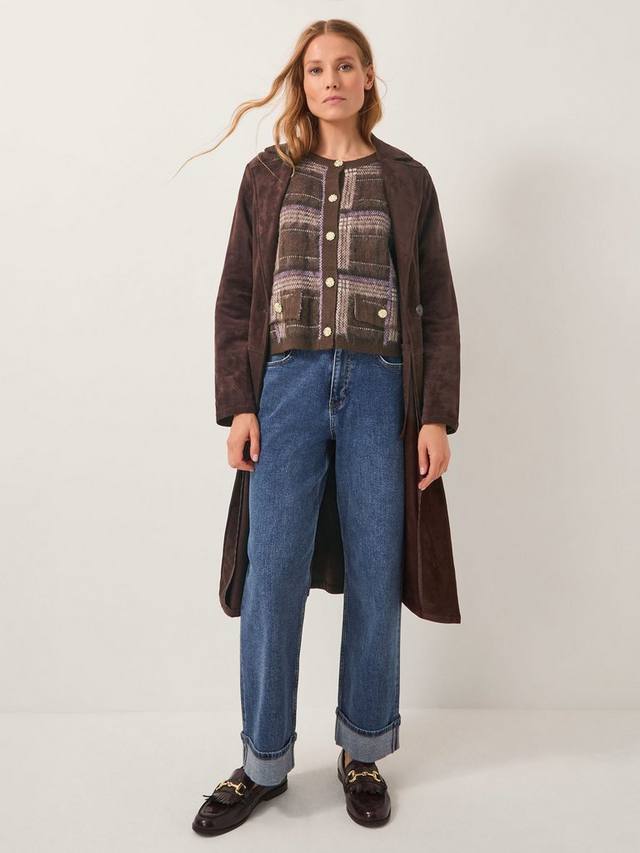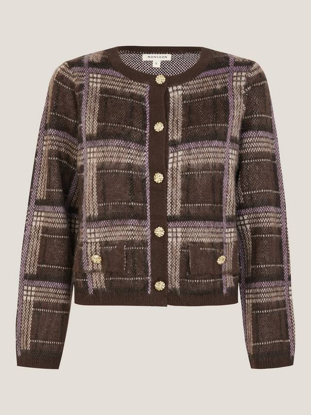Этот кардиган с ярким клетчатым узором представляет собой уютный верхний слой с золотыми пуговицами в виде броши, придающими изделию изысканный вид.