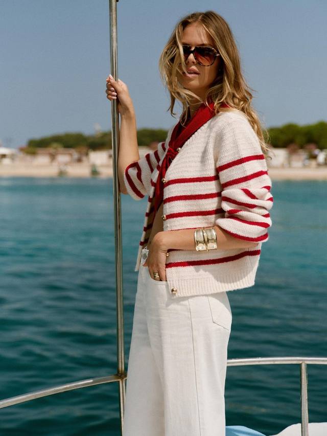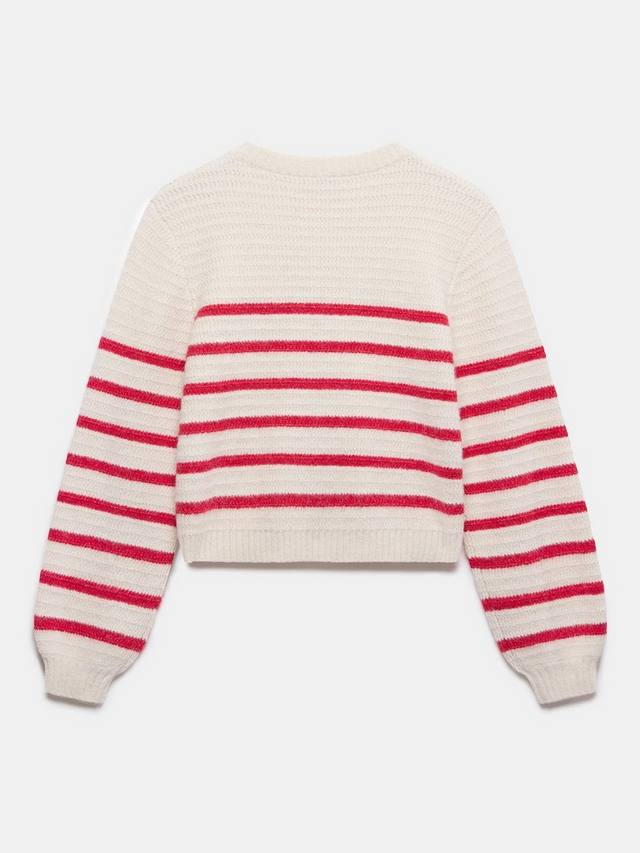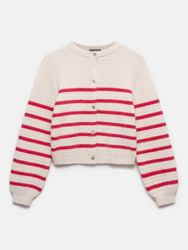 Полосатый кардиган с круглым вырезом, ребристой отделкой, длинными рукавами и застежкой на пуговицы спереди. Изготовлен из шерсти с добавлением роскошной альпаки.