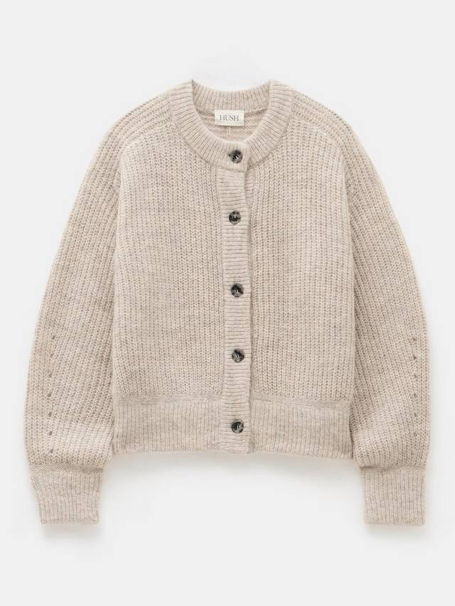 Уютный кардиган в рубчик с объемной отделкой на горловине, манжетах и подоле, рукав-седло, рубчик и 5 роговых пуговиц.