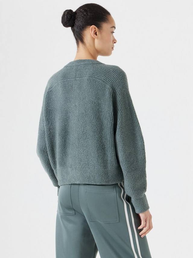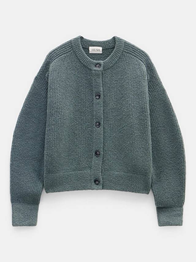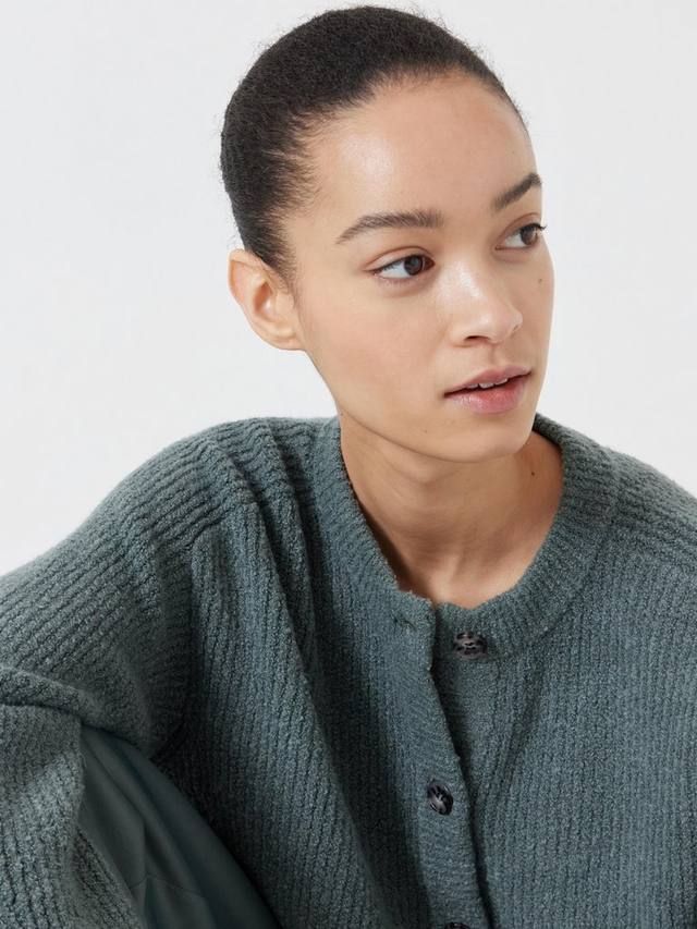 Уютный кардиган в рубчик с объемной отделкой на горловине, манжетах и подоле, рукав-седло, рубчик и 5 роговых пуговиц.
