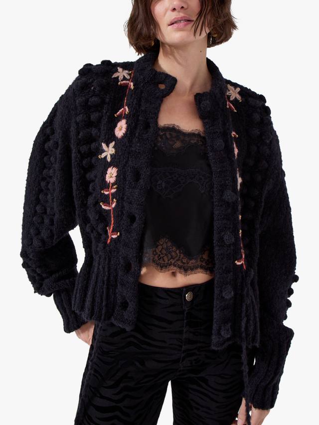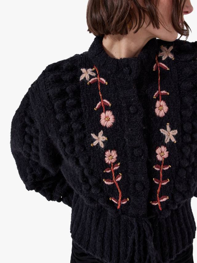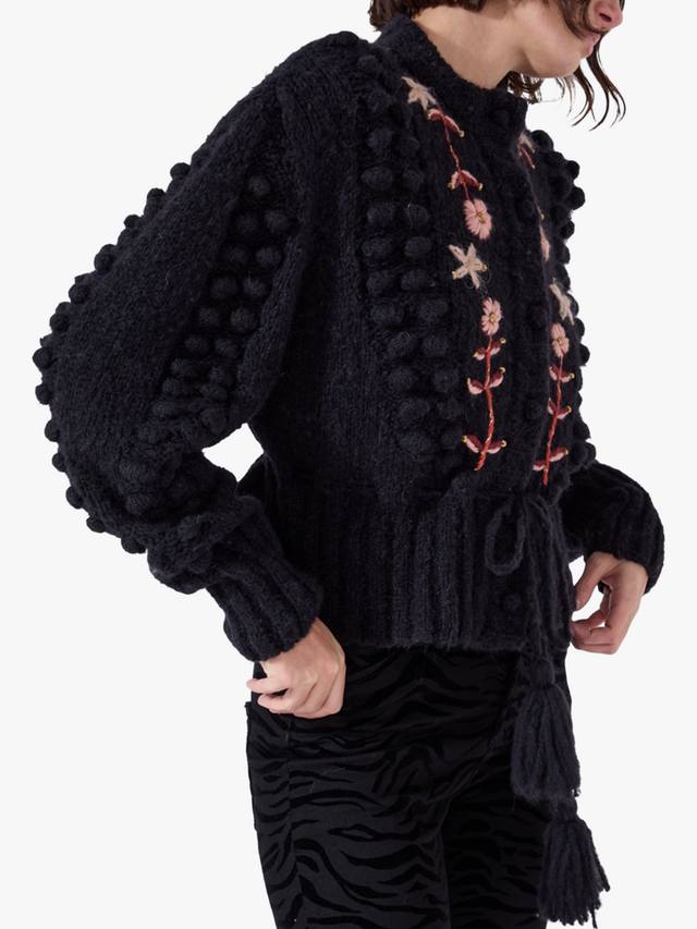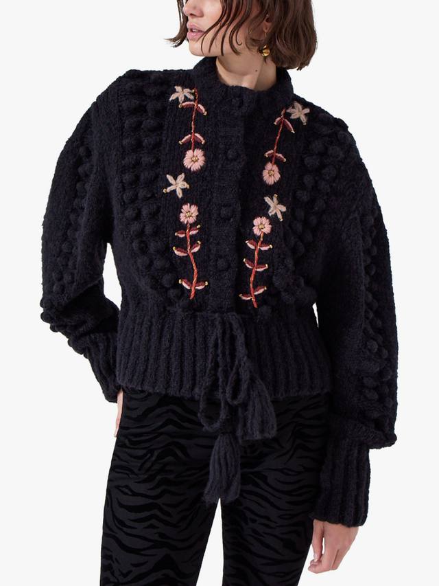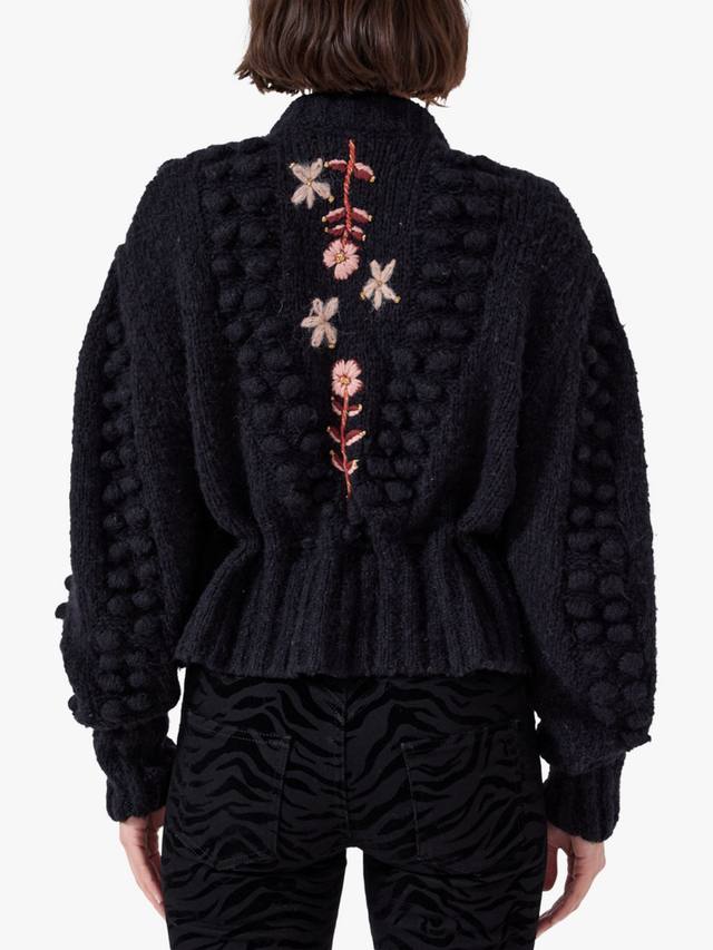 Этот кардиган согреет вас благодаря объемной шерсти альпаки. Удобный крой, цветочная вышивка и отделка в виде помпонов, а также застежка на пуговицы на воротнике обеспечат вам комфортную повседневную жизнь.