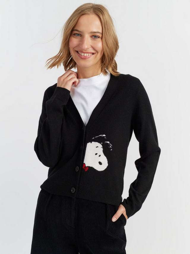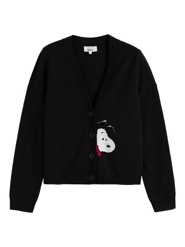 Этот кардиган, сдержанный и очаровательный, украшен выглядывающим из-под него Снупи — тонкий намёк на игривую ностальгию. Связанный из фирменной смеси шерсти и кашемира, он невероятно мягкий на ощупь и обладает вневременной элегантностью.