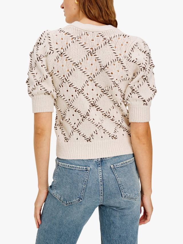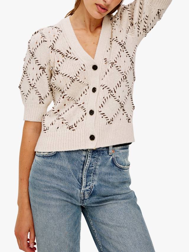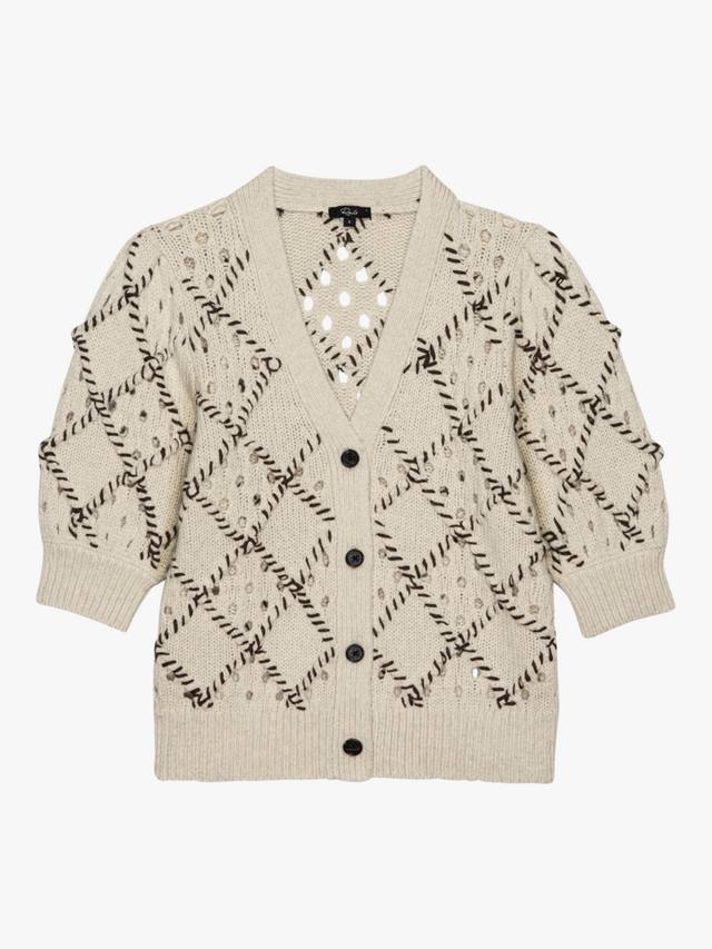 Ощутите комфорт в этом эффектном кардигане с короткими рукавами. Модель Isla выполнена из смесовой трикотажной пряжи с ромбовидным узором, плетеными кожаными пуговицами и волнистой полоской пико, что обеспечивает уют и комфорт. Женственная и изысканная, модель Isla легко украсит любой образ.