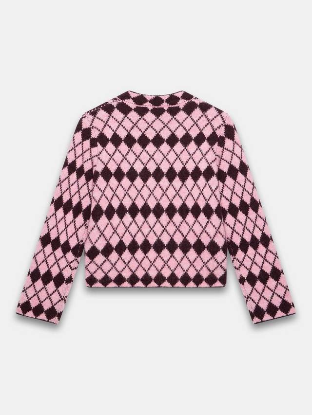 Кардиган бордового тона с узором ромбики с круглым вырезом, длинными рукавами, квадратными карманами и застежкой на пуговицы спереди.