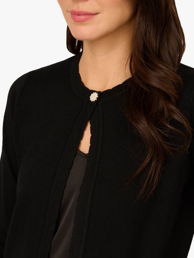 Этот кардиган с длинными рукавами, созданный с учётом сдержанного стиля, выполнен из роскошного мягкого трикотажа, обеспечивающего комфорт и изысканность. Круглый вырез горловины и открытый перед отделаны изящной фестончатой отделкой, придающей изящный вид чистому силуэту. Единственная пуговица со стразами на воротнике играет сдержанным блеском, одновременно застёгивая и создавая изящный акцент. Независимо от того, надето ли это поверх шелковой майки или в сочетании с джинсами с высокой талией, эта вещь легко и элегантно смотрится как днем, так и вечером.