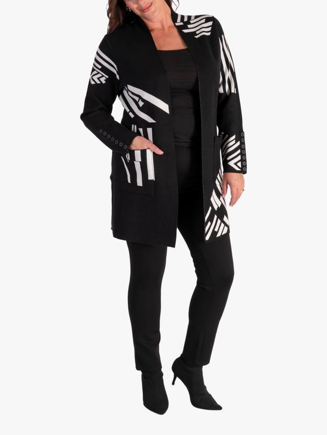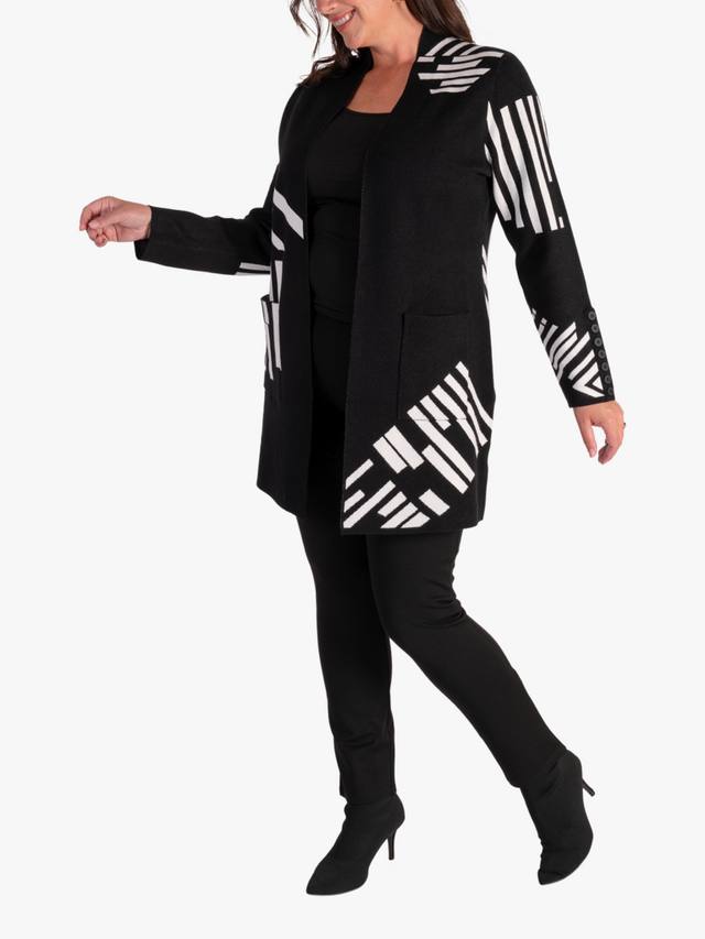 Этот эффектный кардиган станет отличным дополнением к многослойной одежде в прохладную погоду. Он привлекает внимание динамичным монохромным абстрактным узором в полоску. Кардиган дополнен двумя удобными передними карманами и пуговицами на длинных рукавах. Он выполнен из прочного трикотажа, который прослужит долго и украсит любой ваш гардероб в этом сезоне. Длина кардигана 88 см от точки плеча до подола.