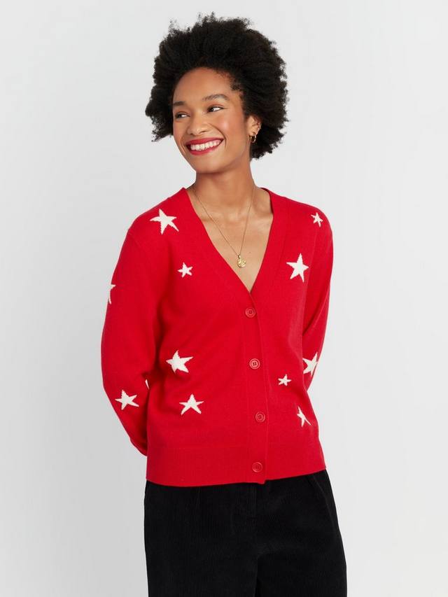 Этот кардиган тонкой вязки из смеси шерсти и кашемира украшен контрастными радужными звездами в технике интарсии. Кардиган имеет свободную посадку, а подол доходит до бедра.
