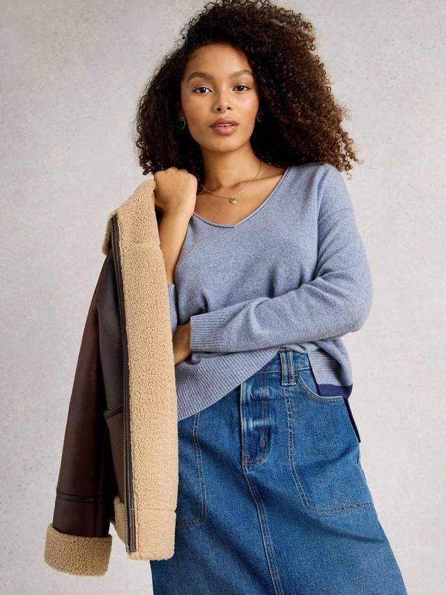Этот джемпер с V-образным вырезом и подвернутым краем от White Stuff, созданный из чистого кашемира, выглядит как чистый холст.