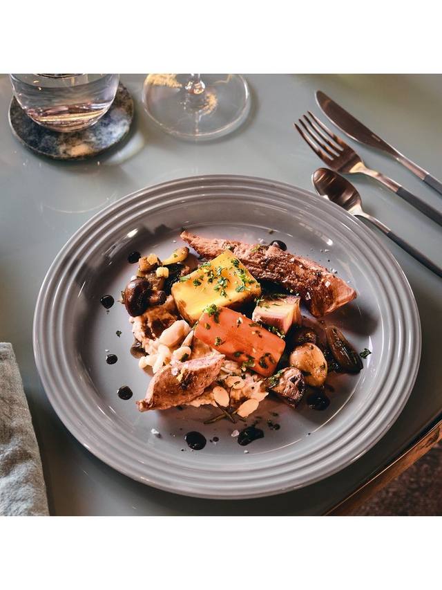 Элегантный фирменный знак Le Creuset в виде трёх колец на ободе этой обеденной тарелки определяет её внешний вид. Кроме того, она имеет углубление для сбора жидкости.