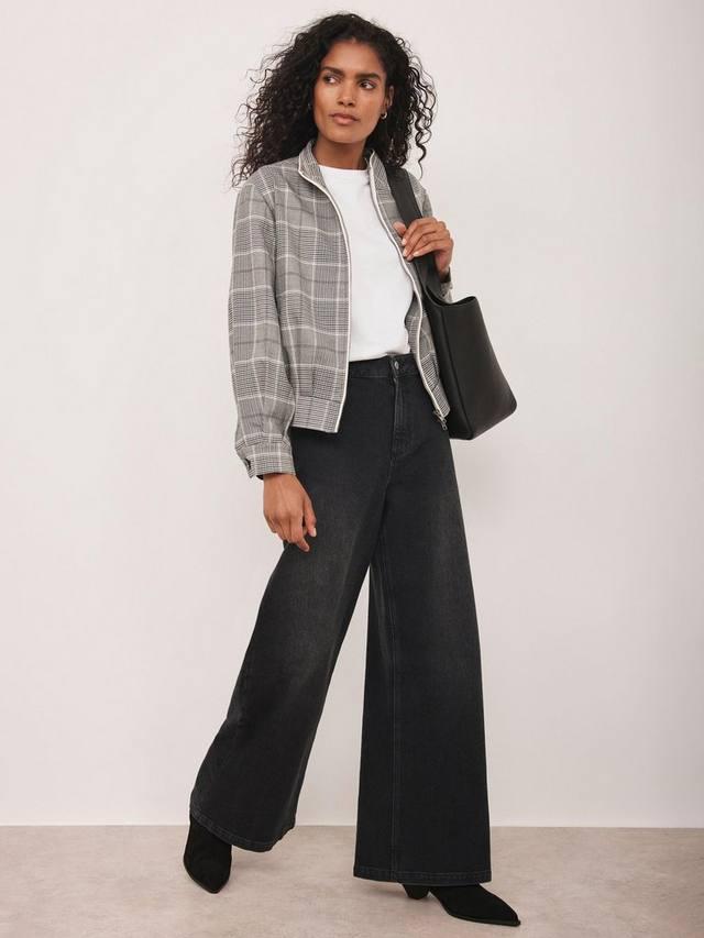 Клетчатая куртка с высоким воротником, длинными рукавами, застегивающимися манжетами, прорезными карманами, присборенной спинкой, контрастной отделкой и застежкой-молнией спереди.