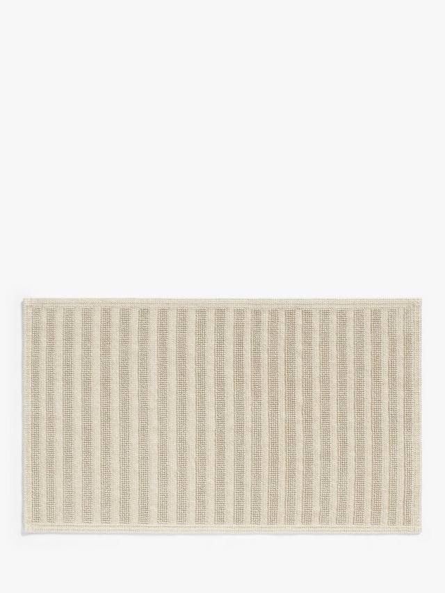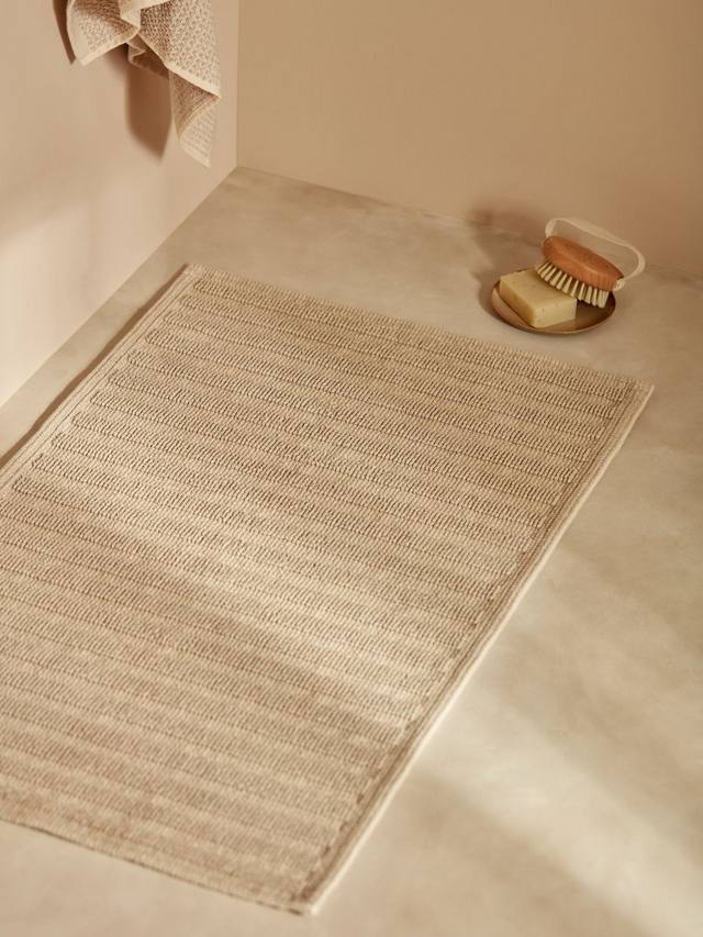 Хлопок придает этому коврику для ванной мягкость, а лен – впитывающую способность. Текстовые и тональные вариации плетения создают простой полосатый рисунок.