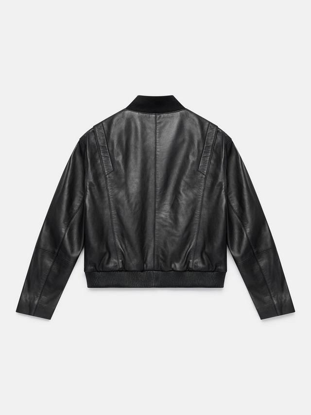 Эта куртка-бомбер из мягкой кожи, неподвластной времени, с ребристым воротником и удлиненными плечами создает уверенный, современный силуэт. Сдержанный нагрудный карман на молнии и карманы с клапанами на кнопках добавляют функциональности, а эластичный пояс и застежка-молния спереди дополняют классический образ.