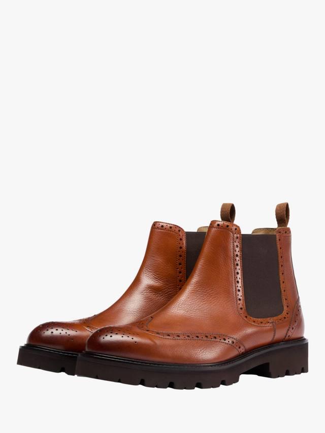 Ботинки челси из светло-коричневой прессованной кожи – мягкой телячьей кожи с зернистой текстурой. Верхняя часть украшена носовой частью с фирменным медальоном Оливера Суини и деталями в стиле броги, охватывающими швы и линию верха. Ботинки имеют прочные эластичные вставки коричневого цвета и петлю с рисунком ёлочка сзади. Внутри – подкладка из цельной телячьей кожи и полукожаная стелька с мягкой подкладкой в области пятки. Подошва Finproject Extralight — обманчиво легкая подошва из прочного состава с массивным рифленым профилем.