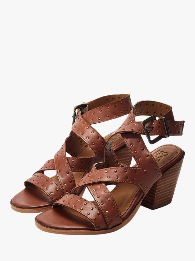 Босоножки Mayley от Moda in Pelle могут похвастаться асимметричными кожаными ремешками, декорированными заклепками, и наборным кубинским каблуком — не слишком тонкий намёк на западные тенденции.