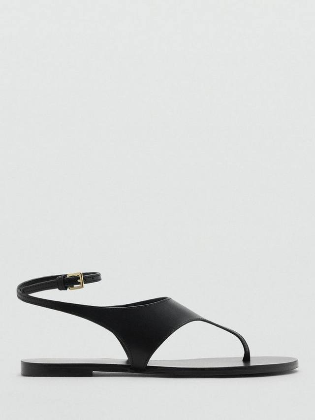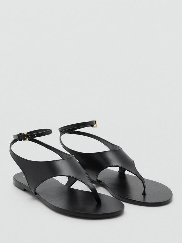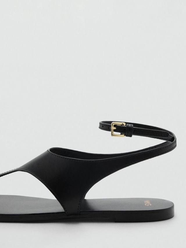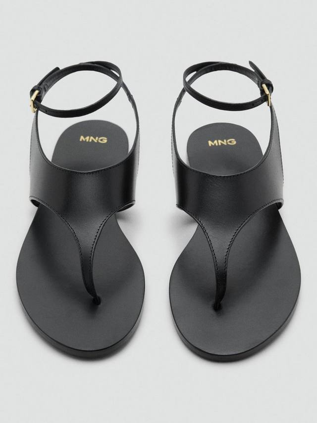 Пара кожаных сандалий с Т-образной перемычкой от Mango. Разработанные для комфорта в течение всего дня, их продуманная застежка-пряжка и плоский каблук обеспечивают легкость каждого шага, делая их практичным завершением всех ваших повседневных летних приключений.