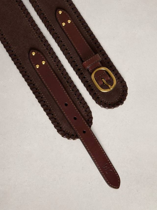 Толстый пояс с эффектным поясом на талии, отделкой в виде обметочного шва и ажурной металлической фурнитурой.