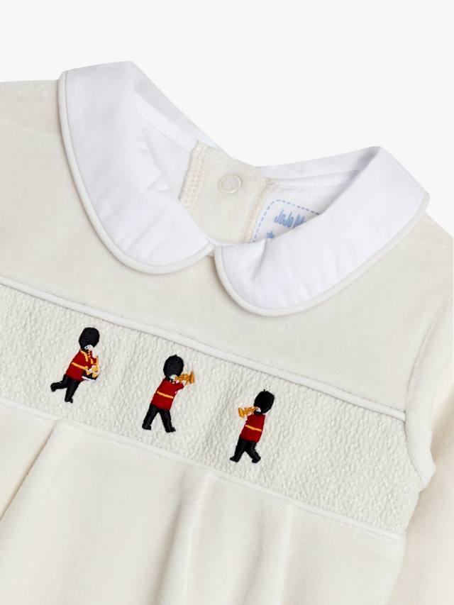 Этот комбинезон из велюра, изготовленный из невероятно мягких тканей, создан специально для больших приключений. Застежки-кнопки от головы до ног, спинки и паха облегчают переодевание, а лондонские красные гвардейцы делают его культовым предметом гардероба для малышей. Вам также понравится воротник в форме Питера Пэна.