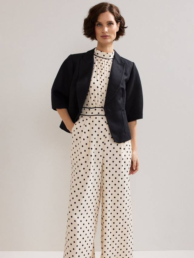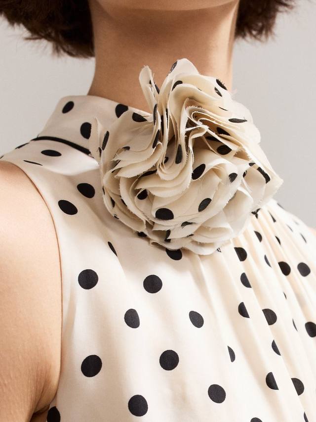 Добавьте нотку горошка в свой деловой гардероб с этим комбинезоном с широкими штанинами. Пояс подчеркивает фигуру, обеспечивая идеальную посадку. Этот комбинезон идеально подходит для ношения как днем, так и вечером. Завершенный романтичной цветочной аппликацией на вырезе, этот стиль идеально сочетает в себе классику и современность, создавая яркий образ.