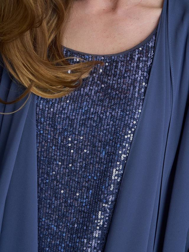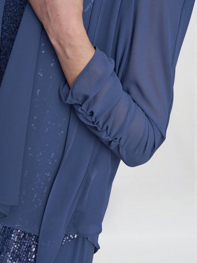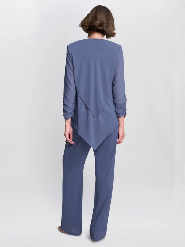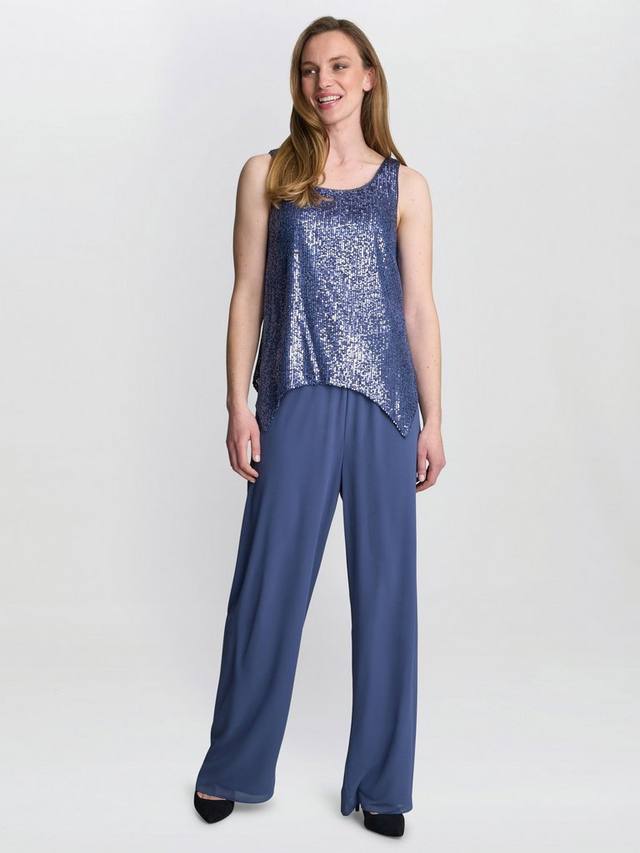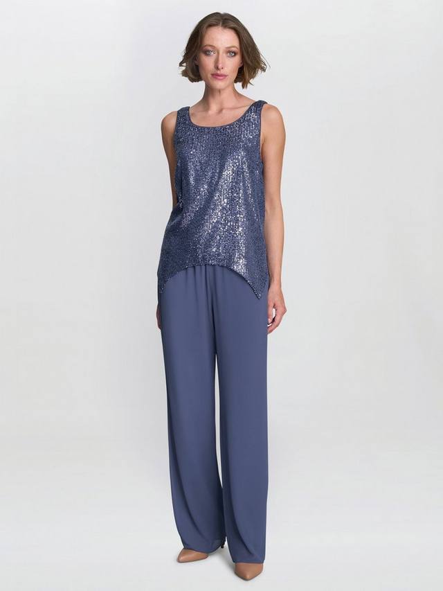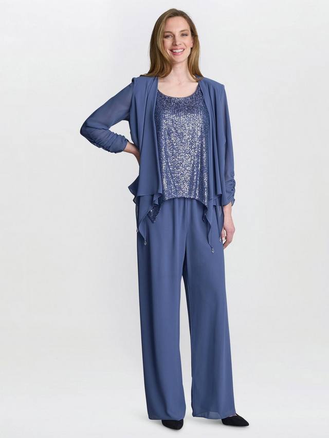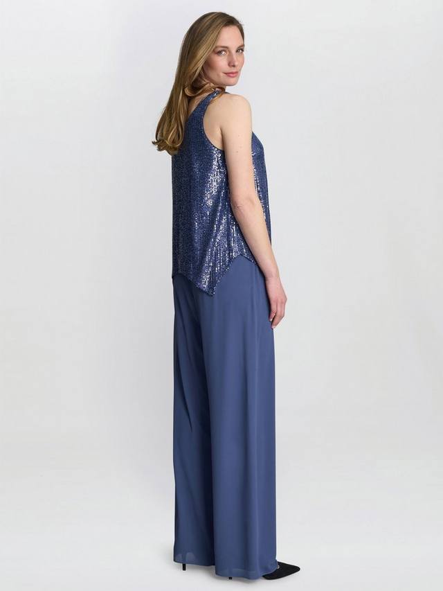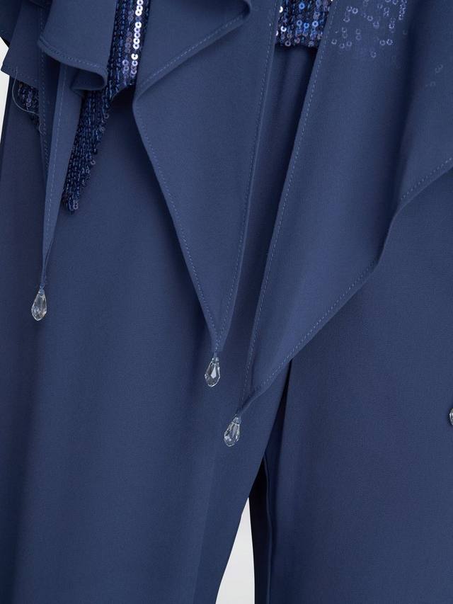 Этот комбинезон без рукавов с широкими штанинами и круглым вырезом от Gina Bacconi может похвастаться мерцающим, полностью расшитым пайетками верхом, струящимся шифоновым жакетом с собранными на рукавах рукавами и привлекательным открытым передом.