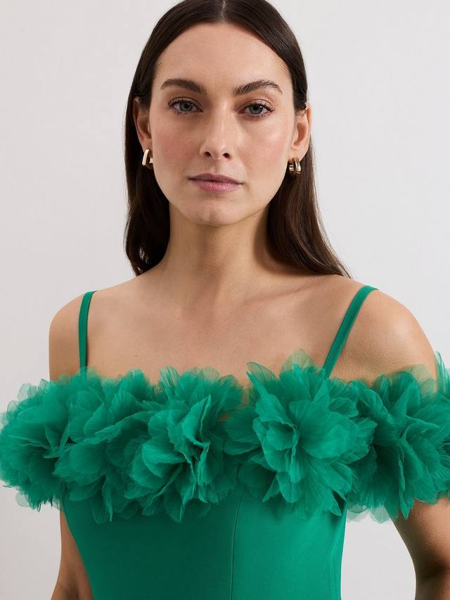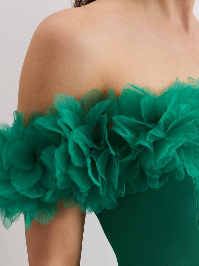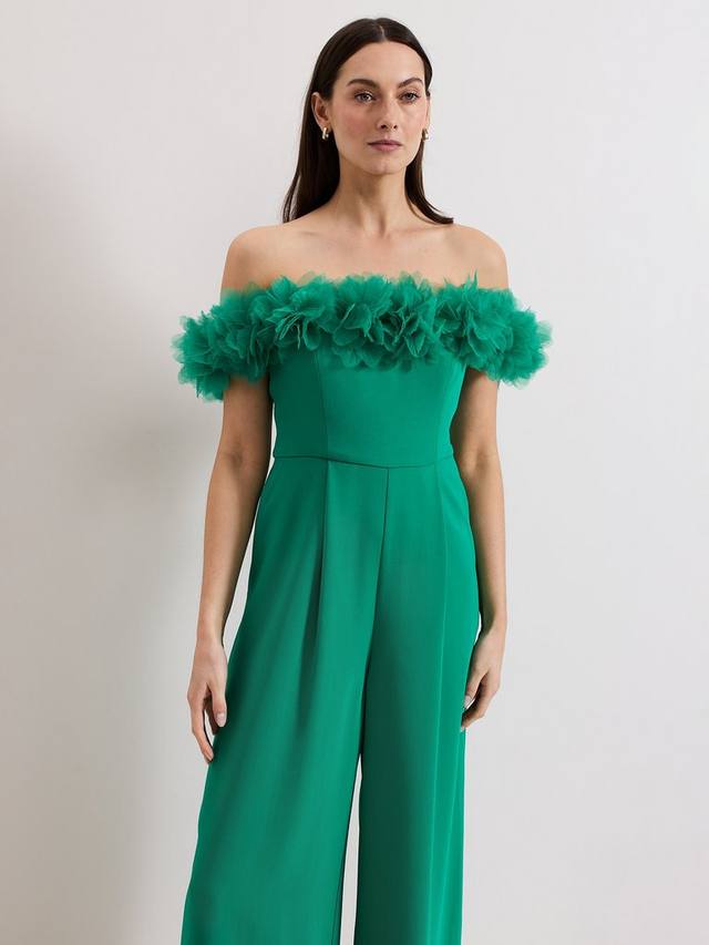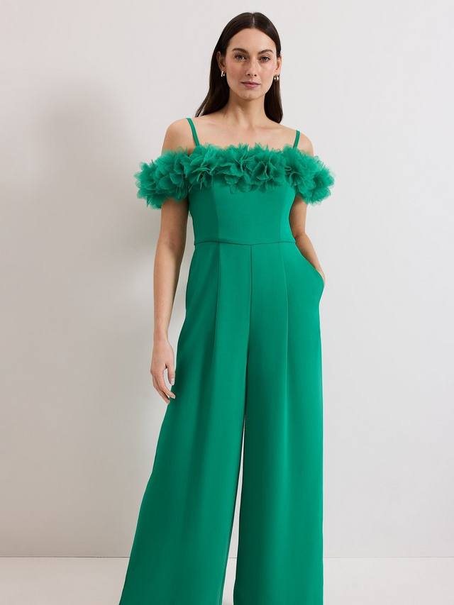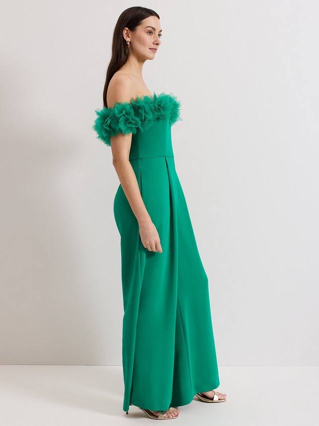 Комбинезон Imogen украшен красивыми оборками на вырезе бардо, что придает ему выразительный вид. Этот изысканный фасон, переходящий в современный широкий крой и структурированный с помощью строгих складок, идеально подходит для любого случая.