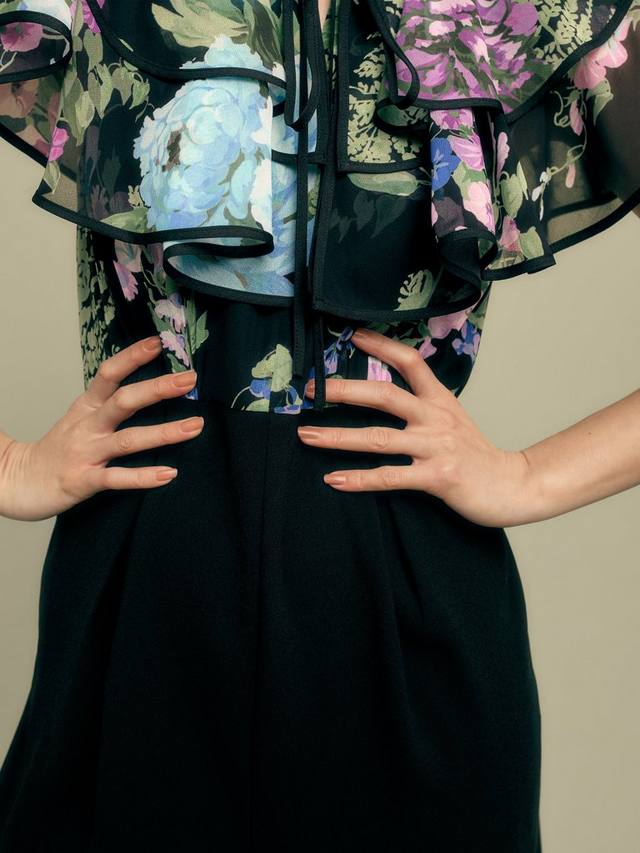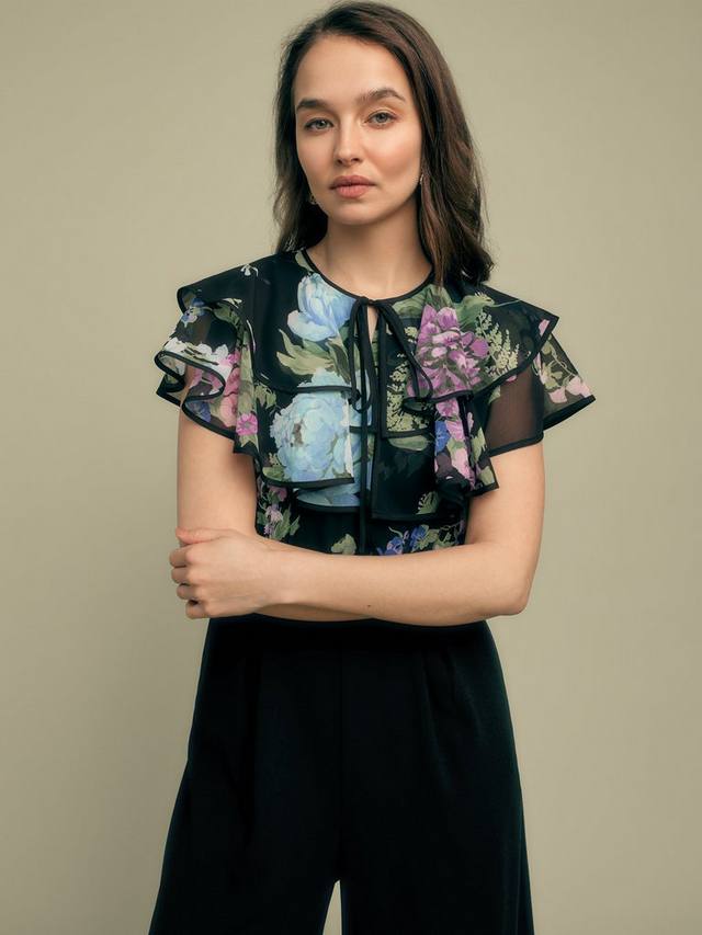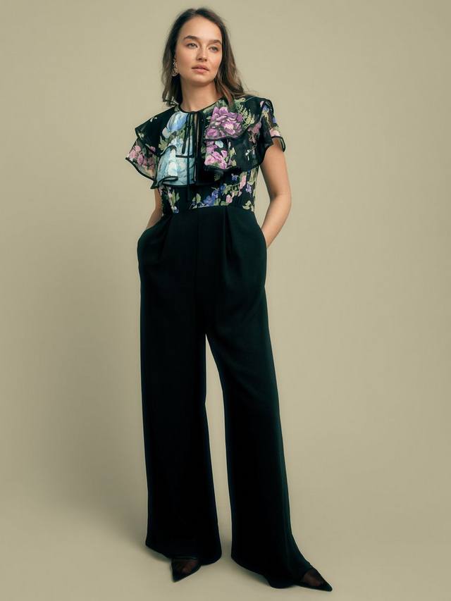 Романтические оборки и изящный завязывающийся воротник в сочетании с широкими креповыми брюками создают идеальный комбинезон.