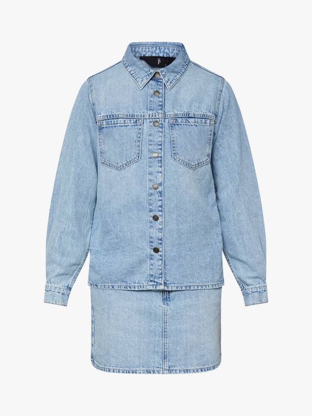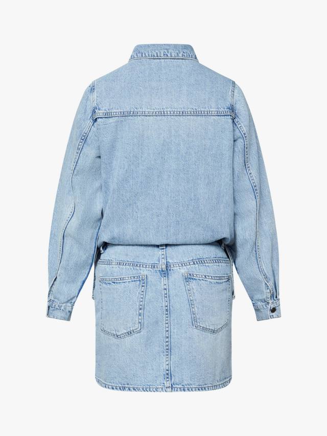 Odia — это цельный комплект, состоящий из топа и юбки из денима. Верх представляет собой рубашку с длинными рукавами, воротником и пуговицами.
