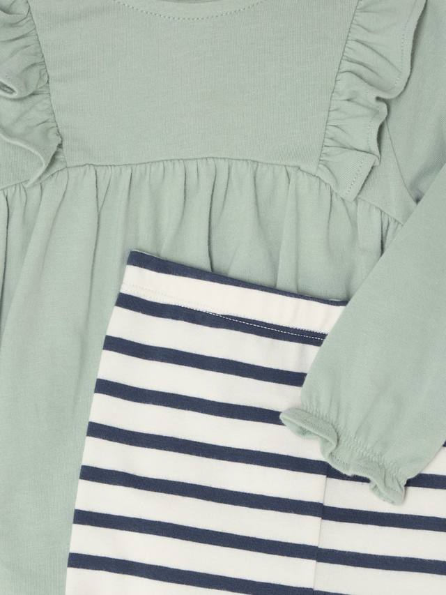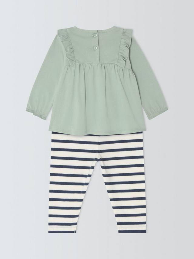 Топ с длинными рукавами и оборками спереди и сзади на плечах. Застежка на пуговицы по центру спины для удобства надевания. В комплекте полосатые леггинсы, идеально подходящие для любого сочетания. Оба изделия изготовлены из чистого хлопка, что обеспечивает комфорт для нежной кожи.