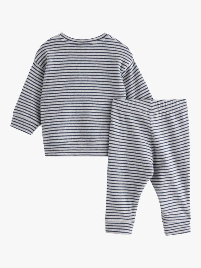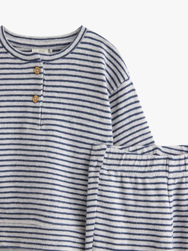 Мягкий и удобный комплект в тёмно-синюю полоску, идеально подходящий для игр дома и прогулок. В комплект входят топ на пуговицах и подходящие леггинсы.
