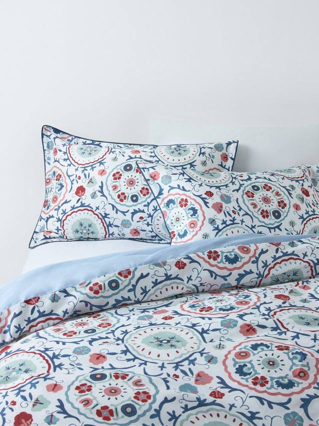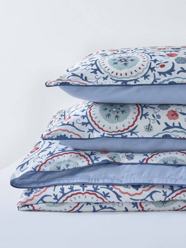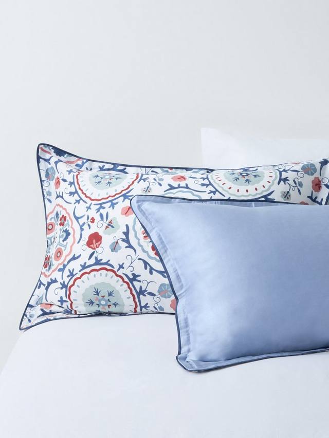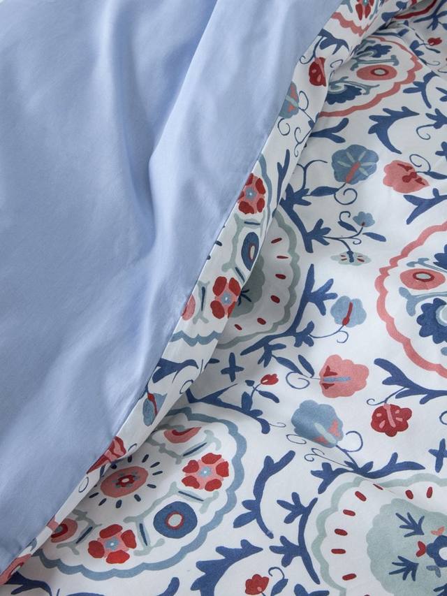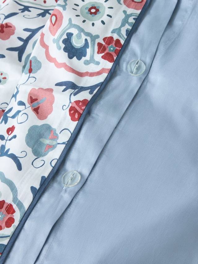 Свежий и симпатичный цветочный принт в народном стиле с оксфордскими краями и контрастной окантовкой. Изнаночная сторона однотонная синяя.
