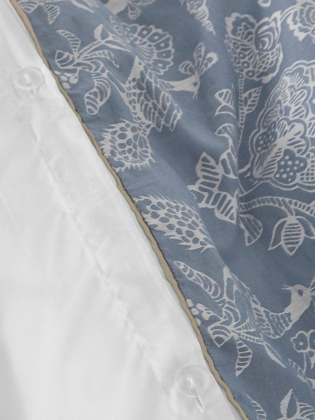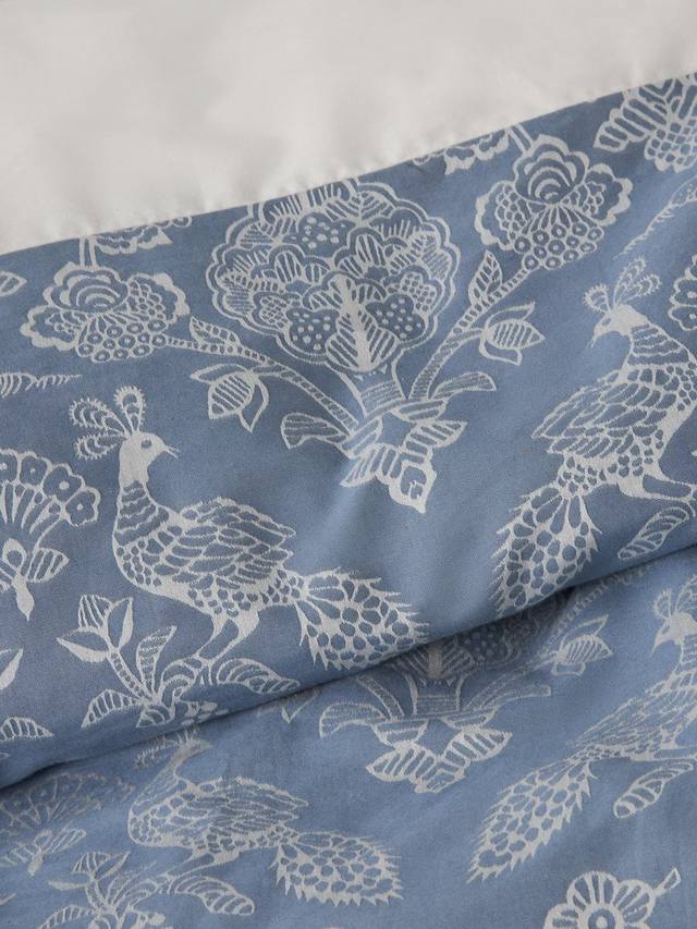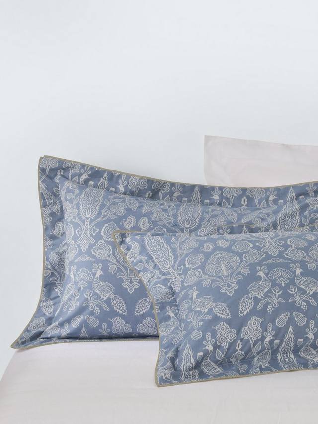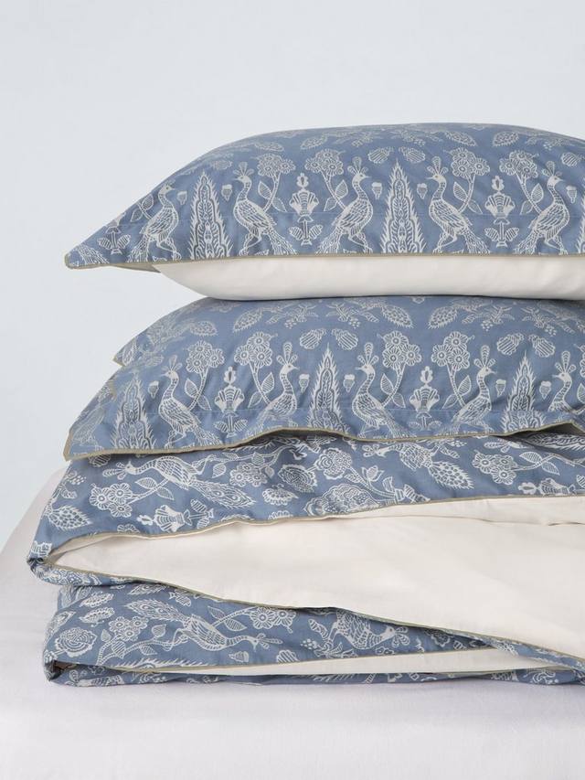 Этот индийский мотив из архива Sanderson, состоящий из стилизованных павлинов, деревьев и бабочек, создаёт очаровательную атмосферу на тканом постельном белье. Двухцветный дизайн, величие павлина, изысканно воплощено в этом жаккардовом постельном белье с простой окантовкой и изнанкой пододеяльника в тон основному цвету. Простота, но эффектность.