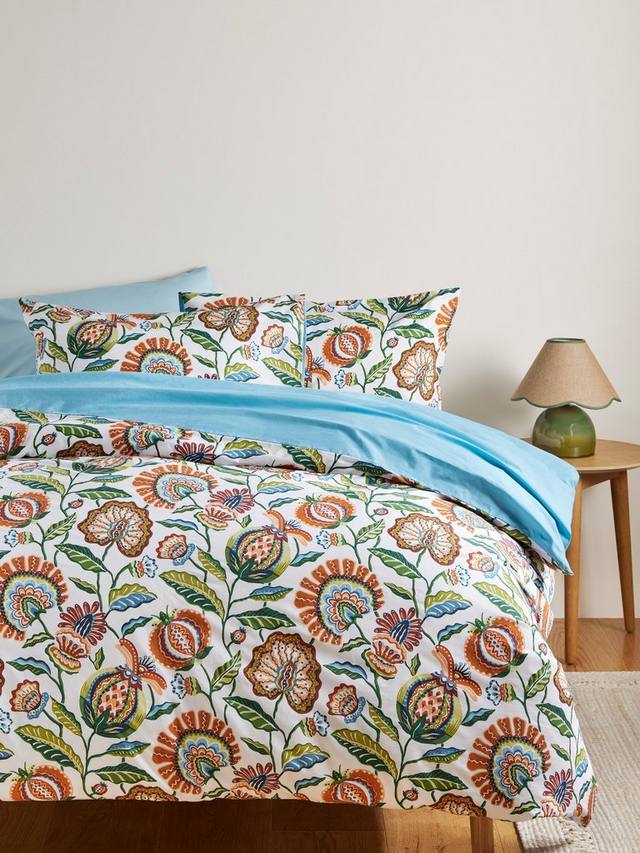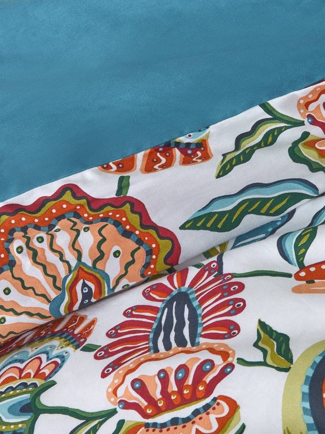 Яркий принт с гранатом на 100% хлопке для прохладного и комфортного ночного сна. Обратная сторона однотонного синего цвета подчеркивает соответствующие тона красочного дизайна.