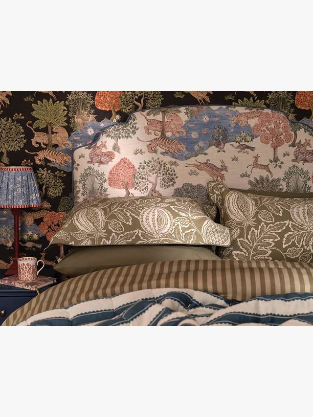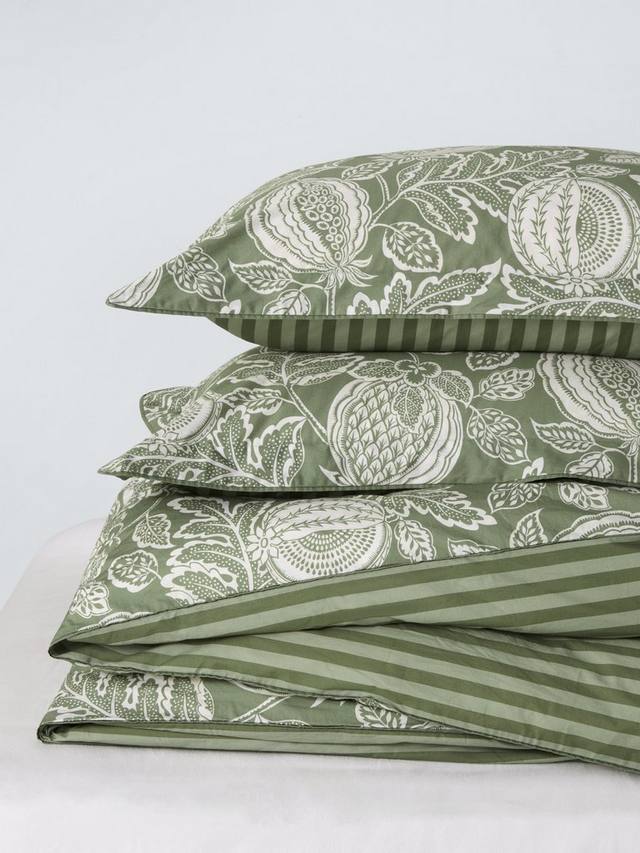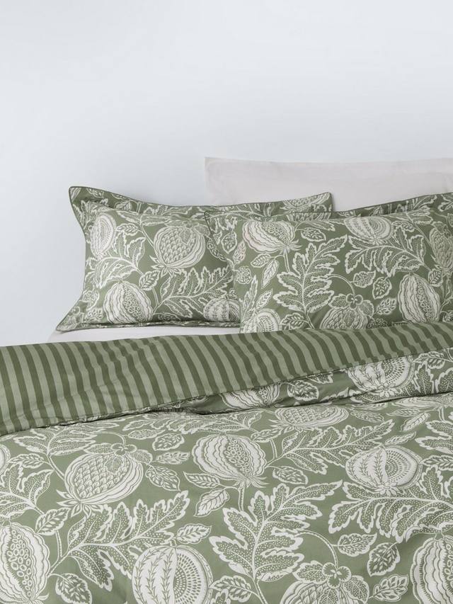 Это постельное белье воплощает элегантный, масштабный, живописный рисунок с крупными фруктами и листьями в нежных тонах. Великолепные стилизованные дыни и замысловатые завитки листьев создают смелое, освежающее акцент в спальне.