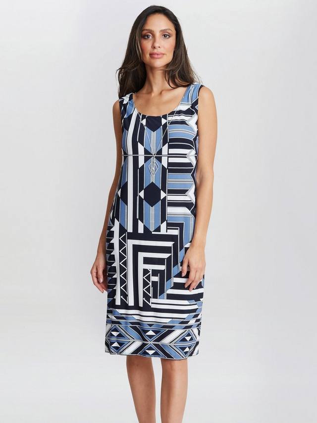 Стиль, о котором не нужно думать. Этот ансамбль включает трикотажное платье без рукавов со съёмным ожерельем, а также трикотажный жакет с лифом-водопадом и рукавами длиной 3/4. Изготовлен из мягкой эластичной ткани для комфорта, легко надевается и украшен ярким геометрическим принтом.