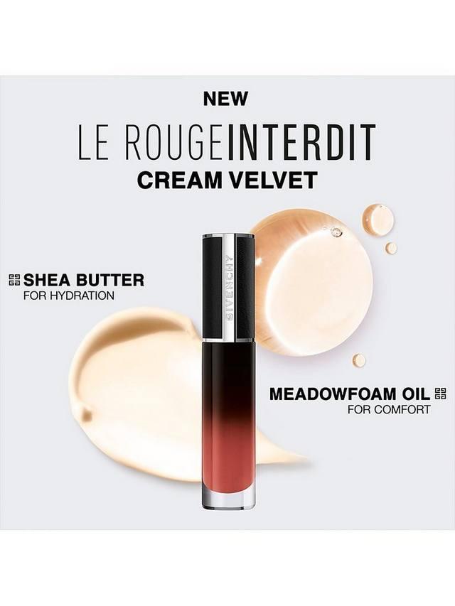 Откройте для себя размытый эффект Givenchy Le Rouge Interdit Cream Velvet, новой кремовой матовой помады с ярким цветом. Обеспечивая 12-часовое увлажнение***, ультра-чувственная формула окутывает ваши губы 12-часовой стойкостью** и комфортом*. Первая кремовая жидкая помада Givenchy, сочетающая в себе неуловимо легкую бархатистую текстуру и невероятную цветопередачу.