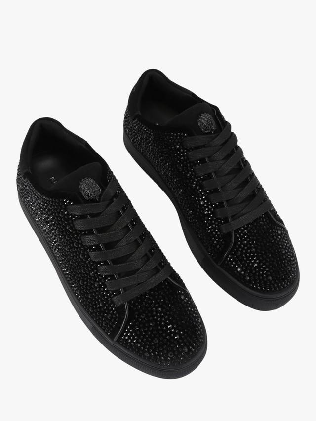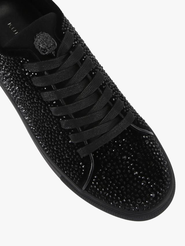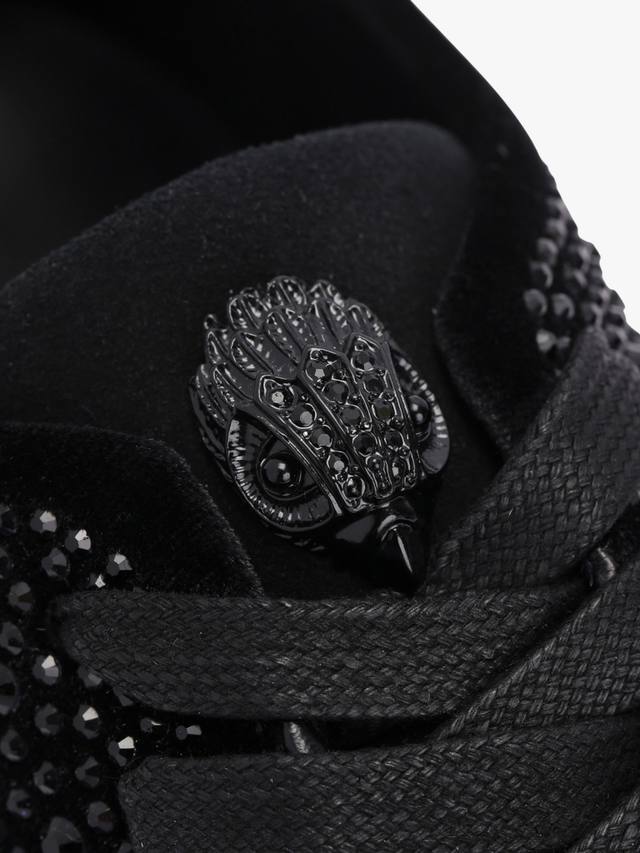 Эти кроссовки Lennon Crystal изготовлены из черного бархата, украшенного черными кристаллами. Передняя часть зашнуровывается, а язычок украшен черной головой орла.