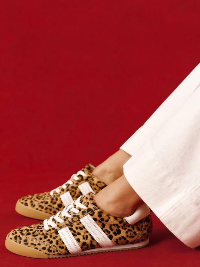 Текстурированные кроссовки с леопардовым принтом нейтрального тона, круглым носком, резиновой подошвой, контрастными кожаными двойными полосками по бокам и хлястиком на пятке со шнуровкой.