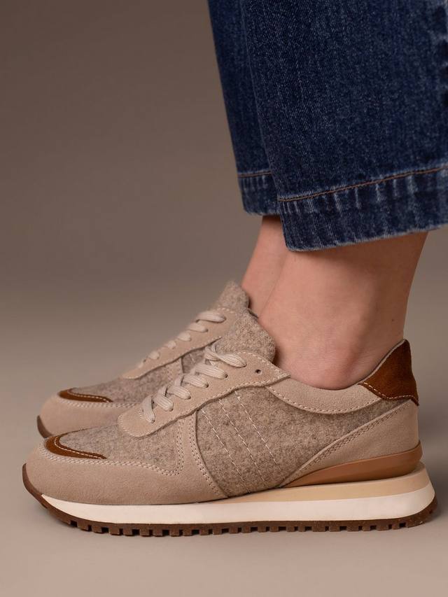 Эти кроссовки в стиле бегуна с верхом из коровьей замши и мериносовой шерсти. Подкладка из нейлоновой махровой ткани и пробковая стелька. В комплекте два комплекта шнурков.