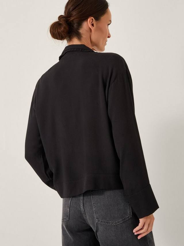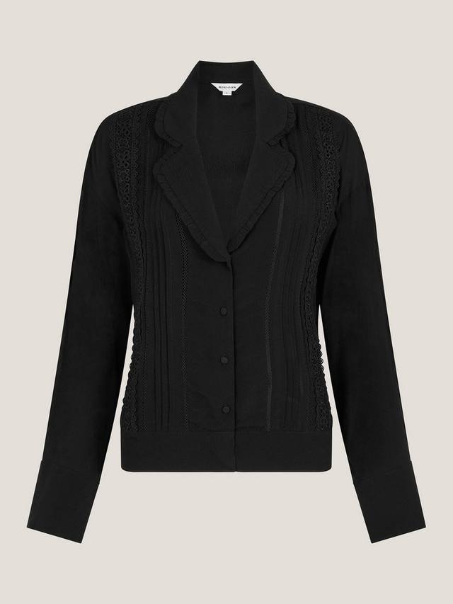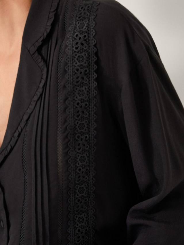 Эта лёгкая и удобная в крое блузка с длинными рукавами, воротником-оборкой и изысканной кружевной вышивкой дополнена застёжкой на пуговицы спереди.
