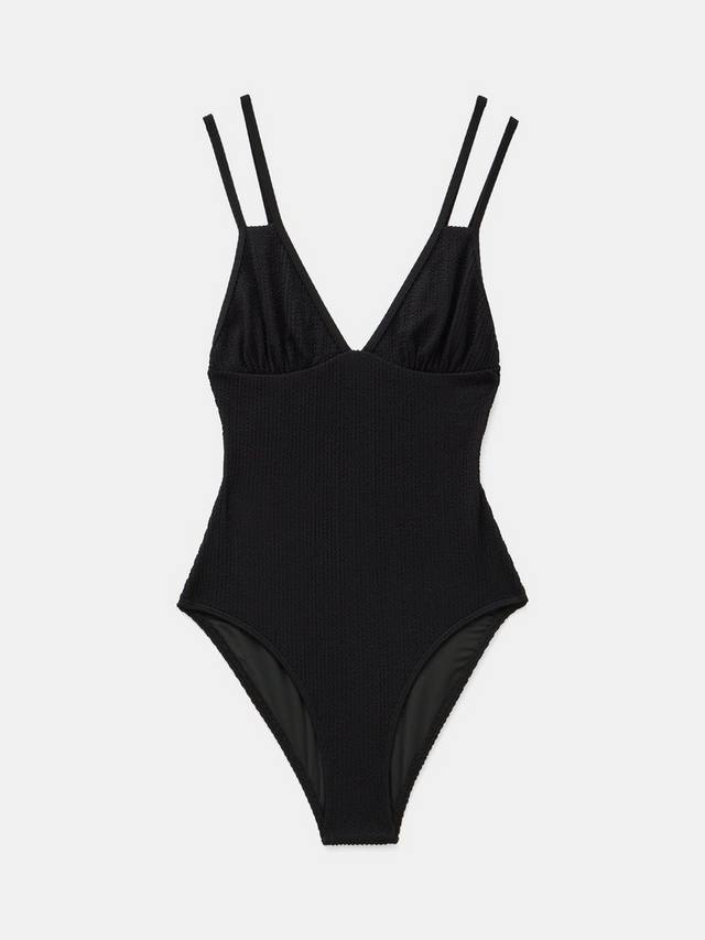Этот купальник из фактурного материала с мелким рубчиком отличается стильным дизайном с двумя бретельками.