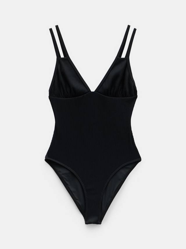 Этот купальник из фактурного материала с мелким рубчиком отличается стильным дизайном с двумя бретельками.