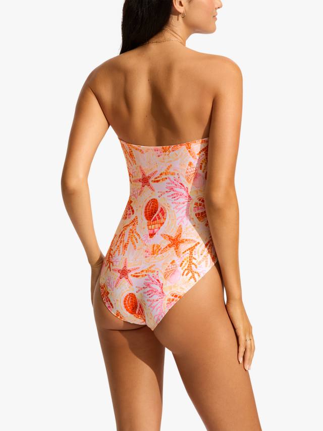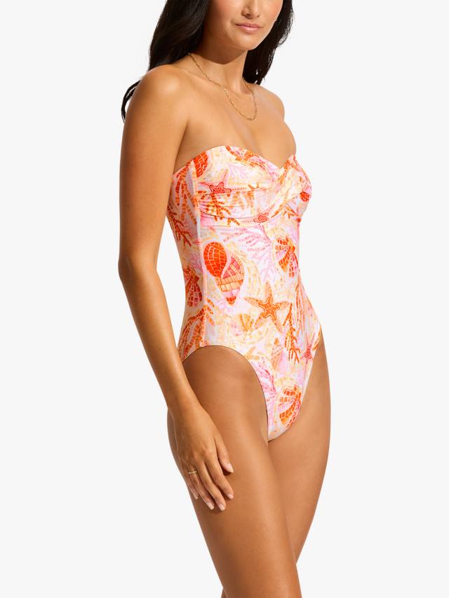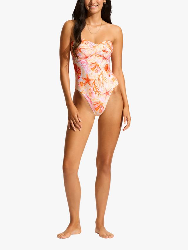 Этот купальник-бандо от Seafolly с ярким принтом в виде ракушек и кораллов, достойным морского побережья, имеет высокие бедра.