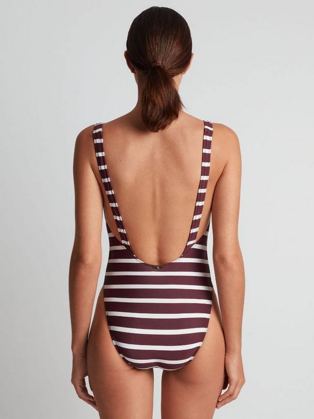 Полосатый купальник с глубоким вырезом на спине и квадратным вырезом, золотистой фурнитурой, съемными чашечками и утягивающим кроем. Обеспечивает облегающую посадку и высокую линию бедра.