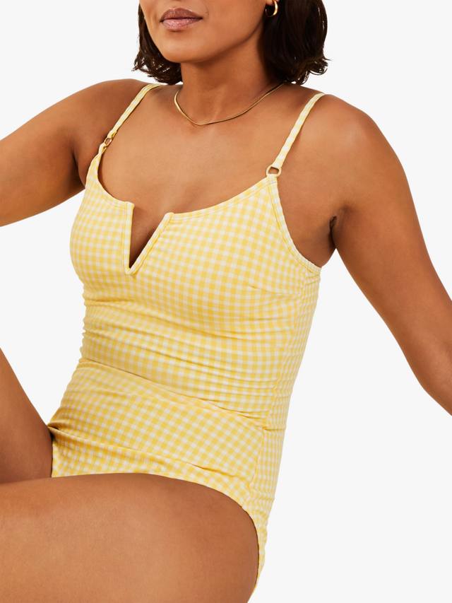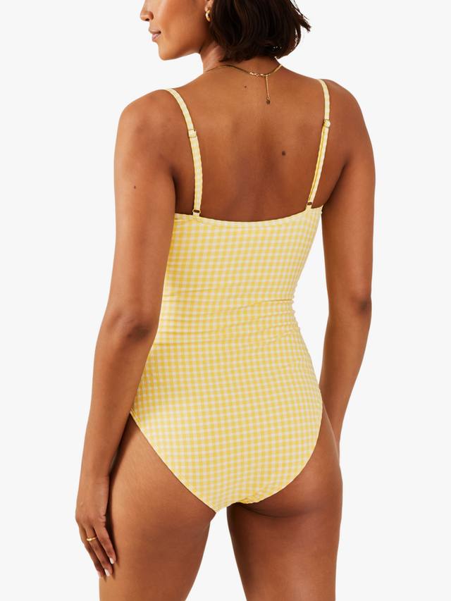 Этот купальник, подобранный под цвет солнца, с V-образным вырезом спереди и милым рисунком в клетку гингем. Регулируемые бретельки украшены золотыми кольцами.