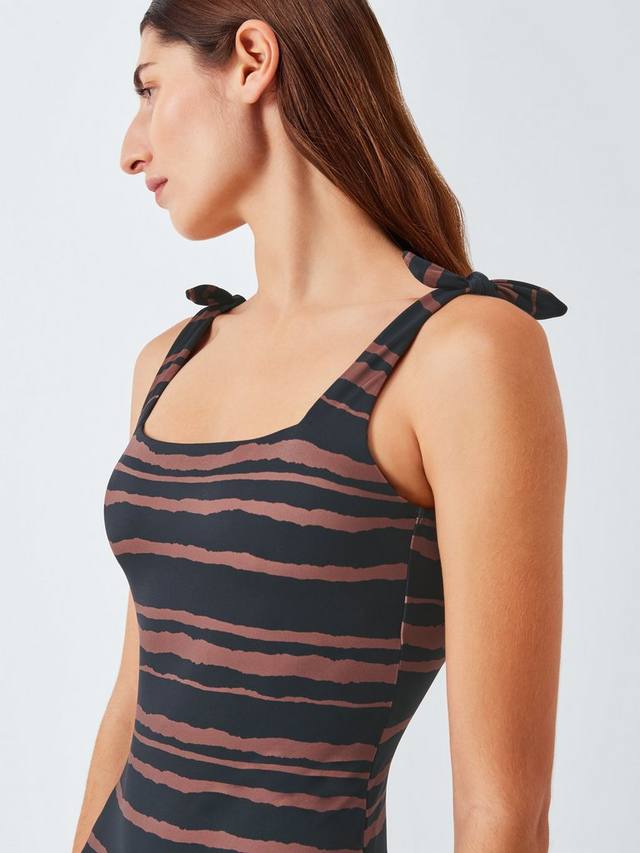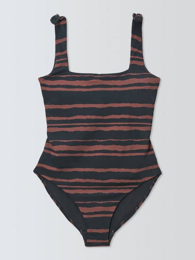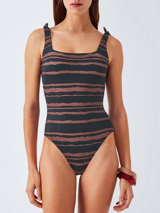 Этот слитный купальник с квадратным вырезом полностью на подкладке с полосатым принтом.