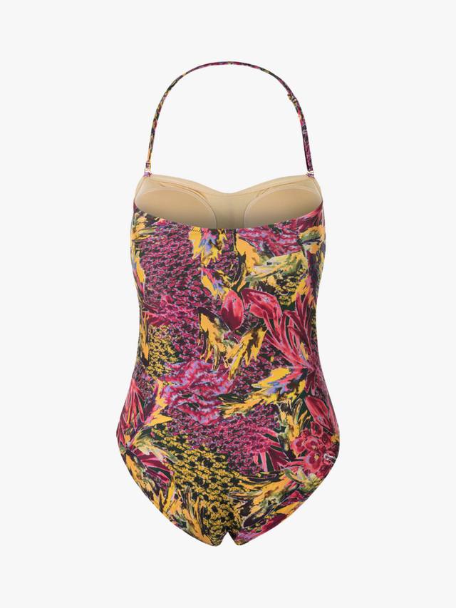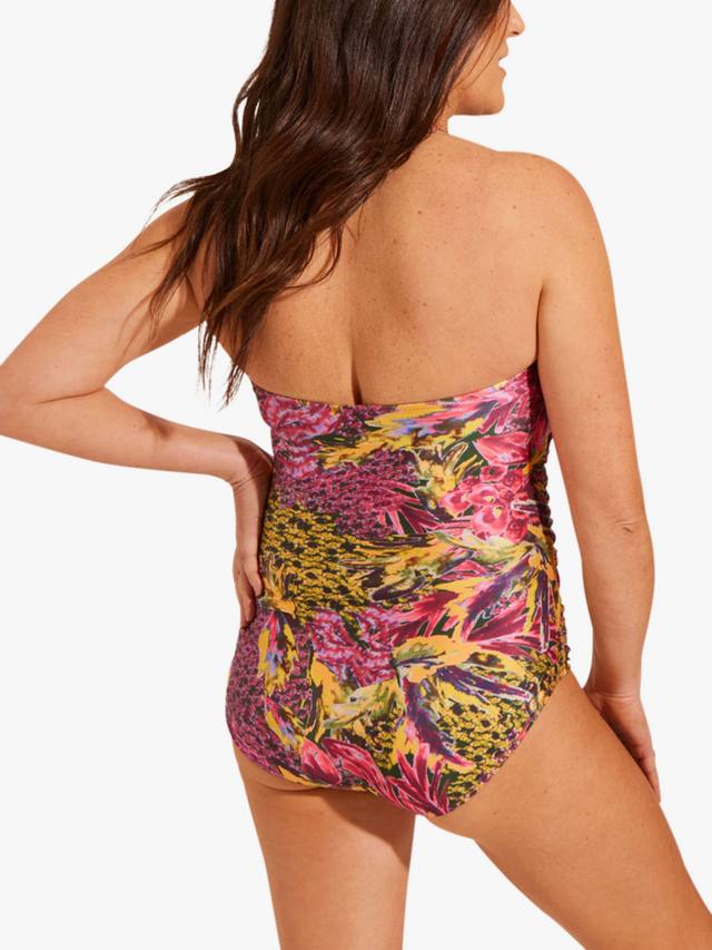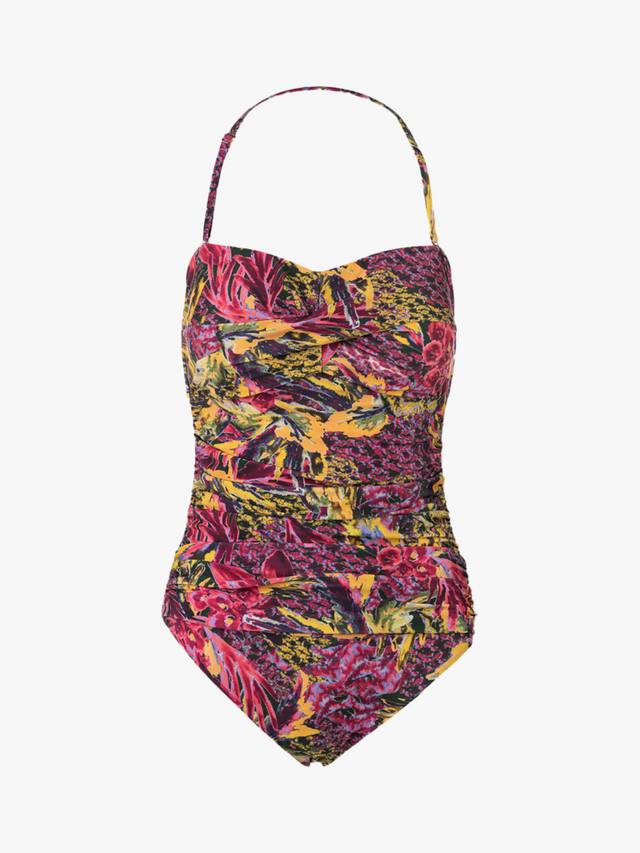 Этот удлиненный купальник имеет драпированный крой и присборенные бока для элегантной посадки. Бретелька-халтер регулируется, а нескользящая полоска надежно фиксирует купальник, если вы решите снять его и получить бандо. Подушечки для груди фиксированные, но мягкие для комфорта, и вы будете выделяться на солнце благодаря яркому тропическому принту.